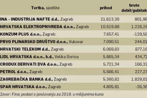 Među deset najvećih nema pridošlica, niti je itko ispao iz tog društva, jedino je bilo nekoliko promjena pozicija. Tu je i dalje pet kompanija iz dominantnog energetskog sektora, tri najveća trgovačka lanca, najveći telekom i najveća banka. Zabrinjava što su čak četiri tvrtki iz TOP 10 prošle godine ostvarile manje prihode nego u 2018.
