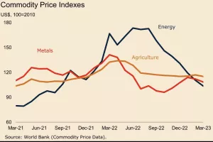Generalno gledajući, cijene burzovnih roba u ožujku su nastavile padati. Cijene energije pale su 6,3 posto na razini mjeseca, predvođene prirodnim plinom u Europi (-16,5 posto) i ugljenom (-9,8 posto). Cijene neenergetskih proizvoda pale su 2,2 posto, pri čemu su sve ključne komponente zabilježile gubitke. Cijene poljoprivrednih proizvoda u ožujku su pale za 1,6 posto.
