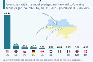 Prema podacima Statiste, američka vlada obvezala se pružiti više financijske pomoći u vojne svrhe od bilo koje druge zemlje. Tijekom analiziranog razdoblja, Sjedinjene Države angažirale su ukupno 46,6 milijardi dolara (bez vrijednosti isporučenog oružja i opreme). Drugoplasirana zemlja, Ujedinjeno Kraljevstvo, obećala je samo 5,1 milijardu dolara. U relativnom smislu, obje obveze vojne pomoći iznose približno 0,2 posto BDP-a svake zemlje. Gledajući ovu metriku, manji susjedi Ukrajine relativno su više pridonijeli ratnim naporima: na primjer Estonija (vojna pomoć od 1,1 posto BDP-a) ili Latvija (0,9 posto). Čak i kada se zbroji vojna, financijska i humanitarna pomoć koju je SAD isporučio ili obećao, to iznosi samo 0,4 posto BDP-a zemlje.