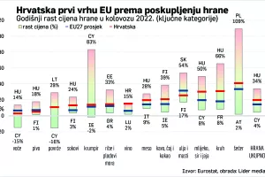 Eurostatovi statističari pozabavili su se ovih dana cijenama hrane u EU. U godinu dana najviše je poskupjela hrana u Mađarskoj, čak 34 posto. Hrvatska je na osmome mjestu s rastom cijena od 19,8 posto, a između su još Litva, Latvija, Bugarska, Estonija, Slovačka i Češka.