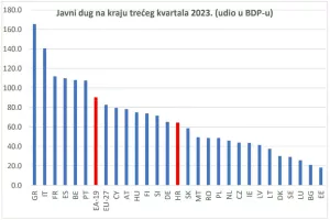 Hrvatska bilježi treći najveći pad javnog duga među članicama EU na kraju drugog kvartala ove godine u odnosu na drugi kvartal 2022. godine, za gotovo 6 postotnih bodova na 64,4 posto BDP-a. Tome pridonosi snažan nominalni rast BDP-a (oko 13,3 posto) nastao na visokoj inflaciji, porezno izdašnom rastu prihoda od turizma te snažnom priljevu EU fondova, a unatoč znatnom povećanju mase plaća, indeksaciji mirovina i socijalnih davanja te povećanju troška kamata.