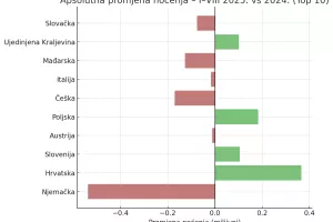 Rast dolazaka iz Slovenije, Velike Britanije, Poljske i s domaćeg tržišta nije bio dovoljan da nadoknadi gubitke, pa je ukupni broj noćenja iz deset najvećih tržišta smanjen za oko 185 tisuća. Statistiku su donekle popravili gosti iz BiH, Ukrajine, Srbije i SAD-a, čija su noćenja porasla za više od 10 posto. Ipak, strani gosti ukupno su ostvarili tek 0,16 posto više noćenja nego lani, a uz domaće turiste rast se penje na skromnih 0,55 posto.