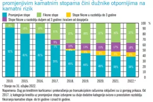 – Na razini sektora možemo primijetiti višegodišnji trend pada udjela kredita s promjenjivim kamatnim stopama, što u konačnici utječe i na veću otpornost kućanstava na kamatni rizik. Prema zadnjim raspoloživim podacima HNB-a, 62 posto potrošača ima fiksnu ili kombiniranu kamatnu stopu, dok ih 38 posto ima promjenjivu.