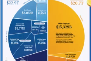 Visual Capitalist napravio je pregled depozita, zajmova i ostale imovine te obveza koje čine zajedničku bilancu banaka u SAD-u koristeći podatke iz Federalnih rezervi. Prema njihovim podacima, američki bankarski sektor ima više od 4000 banaka osiguranih od federalnog regulatora FDIC-a koje igraju ključnu ulogu u gospodarstvu zemlje sigurnim pohranjivanjem depozita i davanjem kredita u obliku zajmova.