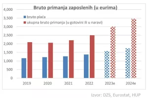 U 2024. godina Hrvatska udruga poslodavaca očekuje povećanje prosječnih bruto plaća od 10 posto, što osigurava dvije uzastopne godine rasta realnih plaća od oko 6 posto i čime Hrvatska prednjači u CEE regiji i na razini EU, navode u ovotjednooj analizi. Dodamo li neoporeziva primanja te primitke u naravi, očekuje se porast ukupnih primanja zaposlenih od dodatnih 15 posto nakon što su primanja tijekom prošle godine skočila gotovo 20 posto.