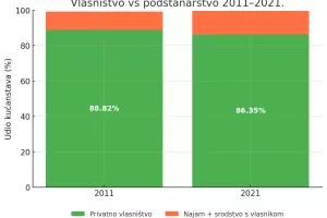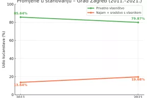 Hrvatska se često ističe kao zemlja s više od 90 posto stanova u vlasništvu. No ta brojka više ne djeluje tako neupitno, osobito kada se usporede podaci posljednja dva popisa stanovništva. Prema podacima Državnog zavoda za statistiku (DZS), stopa vlasništva smanjila se između 2011. i 2021. godine s 88,8 na 86,3 posto.