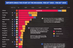 Ruski izvoz fosilnih goriva još uvijek 'teče' u razne zemlje diljem svijeta usprkos brojnim krugovima sankcija koje su joj nametnute. Prema procjenama Centra za istraživanje energije i čistog zraka (CREA), od početka invazije, Rusija je ostvarila više od 315 milijardi dolara prihoda od izvoza fosilnih goriva diljem svijeta, od čega gotovo polovica (149 milijardi dolara) dolazi iz zemalja EU, prenosi Visualcapitalist.