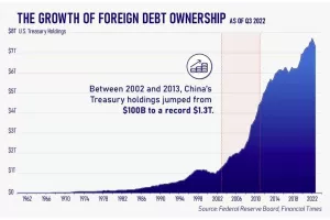 Kao što pokazuje dijagram u nastavku, ovaj pad potražnje pokazuje nagli je preokret u odnosu na period između 2018. i 2020. godine, kada je potražnja skočila jer su se kamatne stope kretale na povijesno najnižim razinama. Sličan trend dogodio se i u desetljeću nakon financijske krize 2008. i 2009. godine, kada su se američki dugovi efektivno utrostručili sa dva na šest bilijuna dolara. Pokretač ovog trenda bila je brza kupnja državnih obveznica u Kini koja je 2013. godine dosegla svoj vrhunac od 1,3 bilijuna dolara. Kako su se izvoz i proizvodnja zemlje širili, prodavala je juane i kupovala dolare kako bi ublažila pritisak tečaja na svoju valutu.