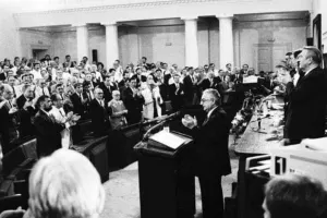 U tim je okolnostima održano konstituirajuće zasjedanje Sabora, koje je obilježio govor tadašnjeg izbornog pobjednika, predsjednika Hrvatske demokratske zajednice (HDZ), a potom i prvog predsjednika hrvatske države Franje Tuđmana. Nije Tuđman u tom govoru naveo samo, 'neke najhitnije neposredne zadaće koje stoje pred novom demokratskom vlasti Hrvatske', kako je to sam kazao. U deset točaka prezentirao je vrlo jasnu skicu projekta samostalne, demokratske, europske države Hrvatske, projekta na čijoj je platformi i pobijedio na izborima. Programska vrijednost tog govora s vremenske se distance vidi mnogo bolje nego u ono doba, u realnom vremenu zatrpanom i zagušenom mnogim govorima, mnogim događajima i operativnim dnevno-političkim odlukama.