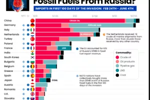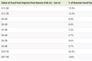 Kada se priča o fosilnim gorivima i tu je EU najveći kupac, pa je u zadnja tri mjeseca 61 posto ruskog izvoza fosilnih goriva išao prema europskim zemljama. Među najvećim uvoznicima ruskih fosilnih goriva su Njemačka, Italija i Nizozemska dok je najveći postala Kina koja je prestigla Njemačku. Također, Rusija je istisnula Saudijsku Arabiju koja je do sada bila najveći kineski dobavljač nafte. Inače, Kina je u zadnje tri mjeseca uvozila oko 2 milijuna barela ruske nafte dnevno, što je za 55 posto više nego u istom razdoblju prošle godine.