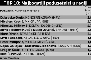Kad je riječ o deset najbogatijih, tu je mrtva utrka – sa po pet poduzetnika iz dviju najvećih država, s tim da najbogatiji u regiji dolazi iz Hrvatske. Prema rezultatima Nedeljnikova istraživanja, najbogatiji poduzetnik u regiji je Dubravko Grgić.