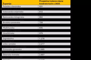 U čak 11 županija Hrvatske za kvadrat kuće traži se manje od 1.000 eura, a daleko najjeftiniji kvadrati mogli su se pronaći u Požeško-slavonskoj županiji iako ona bilježi jedan od viših postotnih skokova. U toj županiji u prosjeku se 2024. godine tražilo 531 eura, dok je ta cijena 2023. bila 452 eura što je porast od 19 posto.
