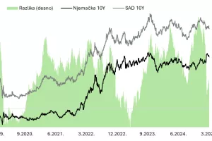 Slika 1. Prinos na desetogodišnje obveznice SAD-a i Njemačke te njihova razlika