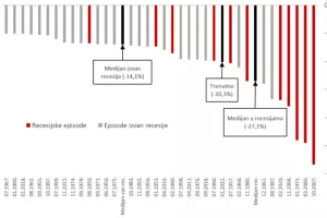 Također, korekcije su izvan recesije tipično trajale oko tri mjeseca dok trenutna ulazi u 7. mjesec što ju približava trajanju povijesno viđenom tijekom recesijskog razdoblja (Graf 2). Kada promatramo 12 recesijskih perioda nakon 1950., dioničko tržište počelo je ugrađivati recesiju u cijene u prosjeku sedam mjeseci prije službenog početka. U svim slučajevima, osim jednog, tržište je doseglo svoj vrhunac prije početka recesije te je došlo do dna prije kraja recesije. Recesija 2000.-ih je jedina koja nije slijedila ovaj obrazac. U tom slučaju dioničko tržište je nastavilo padati još 8 mjeseci nakon kraja recesije, odnosno došlo je do dna tek 30 mjeseci nakon početka pada.