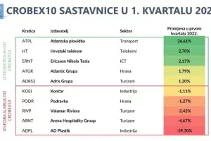 Utjecaj turizma osobit je kada je u pitanju i domaće tržište kapitala uzevši u obzir da dionice turističkih kompanija predstavljaju više od četvrtine težine vodećih dioničkih indeksa Zagrebačke burze. Pregled izvedbe pojedinih sastavnica blue chip indeksa Crobex 10 u prvom tromjesečju 2022. godine prikazano je u nastavku.