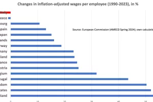 Naime, prema podacima AMECO-a, data baze Europske komisije, realne su plaće od 1990. do 2023., dakle, u više od tri desetljeća, ovisno o zemlji, porasle najviše oko 55 posto. Graf koji je na svome LinkedIn profilu objavio Philipp Heimberger, voditelj makro ekonomskih istraživanja na Bečkome institutu za međunarodne ekonomske studije, pokazuje kako su realne plaće najviše porasle u Irskoj, najmanje u Grčkoj dok je Italija u crvenoj zoni – ondje su realne plaće 4,4 posto manje nego 1990.!