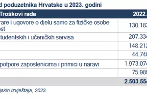 U GFI-u za 2023. godinu poduzetnici su troškove rada iskazali u ukupnom iznosu od 3,0 milijarde eura, što predstavlja 2,1 posto udjela u poslovnim rashodima, što je 0,2 posto više u odnosu na prethodnu, 2022. godinu.