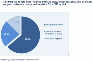 Analiza je pokazala da od ukupnih troškova osoblja, najveći dio otpada na neto plaće i nadnice, 12,7 milijardi eura, što čini udio od 63,8 posto u ukupnim troškovima. Troškovi poreza i doprinosa iz plaća dosežu 4,7 milijardi eura, uz udio od 23,6 posto, dok 2,5 milijardi eura odlazi na doprinose na plaće, što čini udio u ukupnim troškovima od 12,5 posto.