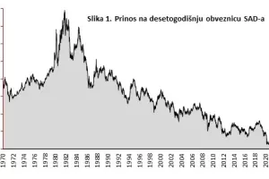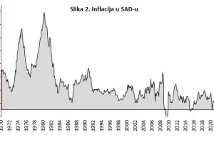 Padu kamatnih stopa svjedočili smo zadnjih nekoliko desetljeća (ili čitali o tome), a zadnjih nekoliko godina pokazalo se kako kamatne stope mogu biti i negativne i to ne samo kod obveznica nekih sigurnijih država, već i na depozite građana. Trend pada kamatnih stopa zapravo traje od sredine osamdesetih godina prošlog stoljeća, što se može lijepo vidjeti na slici 1. Odabran je prinos na desetogodišnju obveznicu SAD-a kako bismo mogli pokazati što dužu seriju, iako je uz „male“ razlike isti trend bio prisutan u svim razvijenim i manje razvijenim državama diljem svijeta. Iako bi bilo vrlo nezahvalno upustiti se u raščlanjivanje kako i zašto svjedočimo praktički neprekinutom padu posljednjih 40 godina, možemo reći kako je najvažniji utjecaj na pad kamatnih stopa imao trend pada inflacije, što se može vidjeti na slici 2.