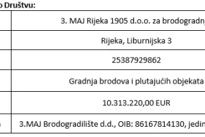 3.MAJ Brodogradilište d.d. je kao vlasnik 100% udjela društva 3. MAJ Rijeka 1905 d.o.o. za brodogradnju sa sjedištem u Rijeci, Liburnijska 3, OIB 25387929862 (u daljnjem tekstu: Društvo), donio odluku o prodaji poslovnog udjela u Društvu.