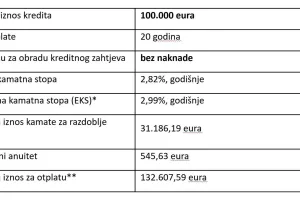 **Ukupan iznos za otplatu uključuje iznos glavnice kredita, iznos interkalarne kamate za razdoblje od mjesec dana te kamate obračunate do dospijeća, a koju bi korisnik kredita plaćao do konačne otplate kredita, godišnju premiju za policu osiguranja imovine u iznosu od 38,00 eura, mjesečnu naknadu za vođenje računa na koji se isplaćuju redovna mjesečna primanja u iznosu od 1,61 euro te trošak procjene nekretnine u iznosu od 275 eura.
