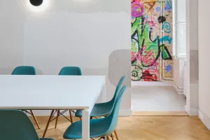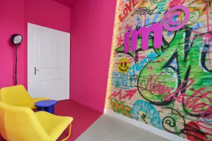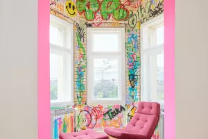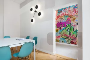 Kao kontrast elementima donjogradskog stana poput zidova s bordurama, grafičkim tapetama i umjetničkim djelima, ogoljeni su zidovi od opeke na ključnim dijelovima prostora oslikani uličnim grafitima koje se (na žalost) mogu naći po gotovo svim fasadama zagrebačkih zgrada. Takva intervencija unosi spoj životnog bila ulice te stvara jedinstven dijalog između stambene prošlosti i urbane sadašnjosti Zagreba. Grafiti na zidovima kreirani su u kombinaciji profesionalnog uličnog umjetnika, samih zaposlenika, arhitekata iz Brigade i klijenata prilikom posjeta agenciji.