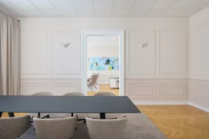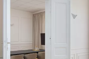 – Ključna karakteristika stana, enfilada, ostala je očuvana i prilagođena novoj funkciji, a očuvani zatečeni parket, nakon sanacije, dodatno naglašava autentičnost i toplinu interijera. Kako bismo osuvremenili prostor, dodani su snažni kontrasti između tradicionalnih elemenata, suvremenih intervencija i zatečenih elementa u prostoru. U tom duhu zadržan je i postojeći tipski spušteni strop koji daje dozu uredske atmosfere kao kontrast nježnijem stambenom ugođaju – ističe Damjan Geber iz Brigade.