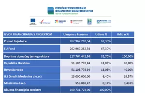 Vrijednost projekta je skoro pola milijarde kuna od čega iz Kohezijskog fonda EU dolazi 262.96.282,54 kn, a preostali dio je sufinanciranje od domaćeg javnog sektora: Hrvatskih voda, Moslavina d.o.o. i Grada Kutine. Na radove Projekta otpada 90% ukupne vrijednosti, odnosno 352.558.256 kn i oni se dijele u dvije glavne skupine: radovi rekonstrukcije i izgradnje sustava javne vodoopskrbe i odvodnje ( 60% ukupne vrijednosti Projekta, odnosno 235.919.570 kn) i projektiranje i izgradnju uređaja kondicioniranja pitke vode (8% ukupne vrijednosti, odnosno, 40.447.640,93 kn) te radovi projektiranja, izgradnje i pokusnog rada UPOV-a Kutina 23.000 ES (22% ukupne vrijednosti, odnosno do 100 milijuna kuna). Ostalih 10% vrijednosti projekta otpada na ugovore vezano uz upravljanje projektom, nadzor i vidljivost te nabavku opreme. Izgradit će se skoro 50 km nove vodovodne mreže i 34 km nove kanalizacijske mreže. Rekonstruirat će se 29 km vodovodne i 13 km kanalizacijske mreže. Izgradnjom nove mreže mogućnost priključenja na sustav javnog vodovoda dobit će 4.838 stanovnika prigradskih naselja koji tekuću pitku vodu nemaju, a mogućnost priključenja na sustav javne odvodnje dobit će 4.376 stanovnika koji trenutno koriste septičke jame.