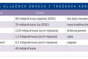 Tvrtkama će ove godine trebati gotovo 25 milijardi kuna dodatnih obrtnih sredstava (bar sedam milijardi kuna više nego dosad), što se može riješiti povoljnim kreditnim linijama, u kombinaciji s državnim poticajima prema bankarskom sektoru. Državna injekcija od 80 posto plaće stajala bi za tri mjeseca oko 12,6 milijardi kuna, a porezni oprost (umjesto odgode) još 1,2 milijarde. Treba još vidjeti može li gospodarstvo, i u kojem roku, platiti tromjesečni trošak od 6,2 milijuna kuna doprinosa za zdravstvo i mirovine. Sve skupa obveze i trošak preživljavanja krize penju se na 45 milijardi kuna.