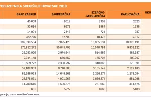 Poduzeća iz tih županija ostvarila su 471,2 milijarde kuna poslovnih prihoda (60 posto od ukupnih 786 milijardi kuna) i od svojih poslovnih aktivnosti ostvarila 21,1 milijarde kuna neto dobiti (68,3 posto od 31 milijarde kuna neto dobiti realnog sektora).