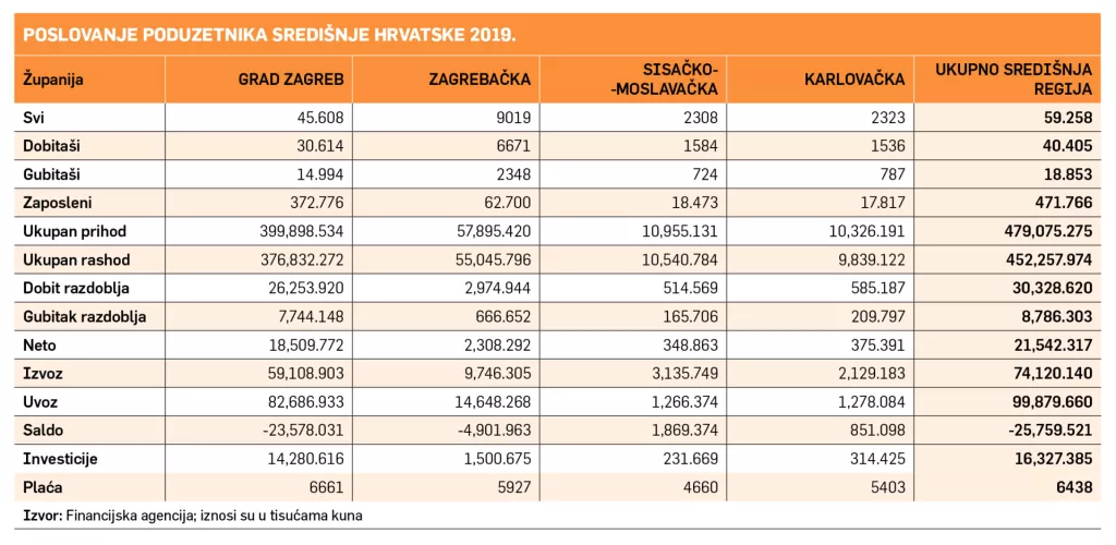 Više od trećine svih tvrtki u Hrvatskoj posluje iz Središnje Hrvatske – Grada Zagreba, Karlovačke, Sisačko-moslavačke i Zagrebačke županije. Ondje je koncentrirana gotovo polovina ukupnih prihoda svih poduzeća koja posluju u zemlji, u toj je regiji najviše otvorenih radnih mjesta i plaće su osjetno veće nego u ostatku Hrvatske, posebno u Zagrebu. Prošla im je godina bila uspješna, čemu se nadaju i 2021.