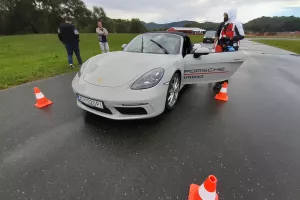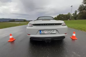 S Taycanom smo stigli i do karting staze u Novom Marofu gdje je bio organiziran takozvani ' launch control' s Taycanom. Za one koji ne znaju, to je linearno ubrzanje koje je s električnim Taycanom nevjerojatno jer nakon što pustite kočnicu, dok je druga noga na do kraja na papučici gasa, Taycan vas lansira u orbitu. Onima slabijeg želuca launch control s Taycanom ne bi preporučili jer osjećaj želuca u grlu nije za svakoga. U svakom slučaju, Taycan za samo 4 sekunde stiže do 100 km/h što se itekako osjeti kada ste vi za volanom.  Na istoj stazi organizirana je i vježba zaobilaženja čunjića s Porsche 718 Boxerom.