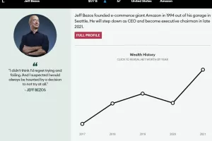 Jeff Bezos četvrtu je godinu zaredom najbogatiji na svijetu, vrijedan je 177 milijardi dolara. Amazon je nedavno najavio da Bezos u drugoj polovici ove godine odstupa s mjesta predsjednika Uprave te da će u budućnosti tek obnašati dužnost izvršnog predsjednika, a to bi mu trebalo dati više 'vremena i energije' za neke nove ideje, budu li i nove ideje tako plodne teško da će ga taj odmor koštati previše.