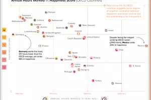 Današnja infografika pokazuje podatke iz Svjetskog izvještaja o sreći iz 2019. godine i OECD-a (Organizacija za ekonomsku suradnju i razvoj) kako bi se vidjela povezanost između sreće neke zemlje i prosječnog radnog vremena po osobi.