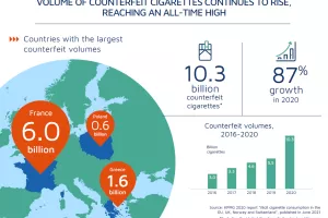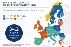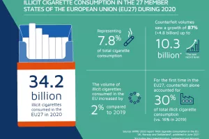 Philip Morris International Inc. (PMI) poziva javne i privatne predstavnike na zajedničku borbu protiv ilegalne trgovine budući da je objavljeno novo izvješće KPMG-a o potrošnji i protoku ilegalnih cigareta u 30 europskih zemalja - 27 država članica Europske unije (EU), te Velikoj Britaniji, Norveškoj i Švicarskoj. Iako ukupna potrošnja cigareta nastavlja opadati, studija procjenjuje da se udio ilegalnih cigareta povećao za pola postotnog boda, na 7,8posto ukupne potrošnje u 2020. godini, dosegnuvši broj od 34,2 milijarde cigareta potrošenih u 27 država članica EU-a (EU27). Porast broja ilegalnih cigareta - koji se sastoji od krijumčarenja, krivotvorenja i cigareta legitimno proizvedenih u jednoj zemlji koje se ilegalno krijumčare u drugu i prodaju bez plaćanja carine (tzv. illicit whites) - potaknut je neviđenim porastom potrošnje krivotvorenih cigareta od 87 posto. Porezni gubitak za vlade u EU27 sada iznosi približno 8,5 milijardi eura.