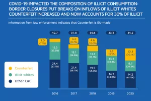 Godišnja studija koju je neovisno proveo KPMG, a naručio PMI, pokazuje kako je na legalnu i ilegalnu potrošnju cigareta utjecala pandemija COVID-19, razdoblje zaključavanja i ograničenog kretanja ljudi unutar EU u kombinaciji s padom kupovne moći. Izvještaj procjenjuje da se ukupna potrošnja cigareta u 2020. godini smanjila za 4,7 posto na 438,8 milijardi u EU27, dok su granične kontrole i ograničenja putovanja povezana s bolesti COVID-19 rezultirala naglim padom potrošnje cigareta koje nisu iz domaće proizvodnje, koja je u 2020. pala za 18,5 posto (11,9 milijardi cigareta). Također se primjećuje da se u 2020. pad ukupne potrošnje cigareta poklopio s rastom od 6,0 milijardi jedinica ekvivalenta cigarete u kategoriji fino rezanog duhana.