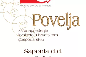 Hrvatsko društvo za kvalitetu dodijelilo je svoje tradicionalno priznanje 'Povelju HDK za 2021. godinu' Saponiji za unaprjeđenje kvalitete u hrvatskom gospodarstvu.