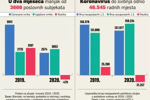 Posebno je dramatičan bio travanj, kad je izgubila 76 obrta, 139 d.o.o.-ova, i još 69 j.d.o.o.-ova. Ipak, ponešto se i otvaralo. Osnovano je, primjerice, 357 obrta, ali to je samo petina od 1629 novih obrta osnovanih u travnju 2019. Treba reći da je otvaranje trgovine, ugostiteljstva i uslužnih djelatnosti smanjilo pad broja tvrtki i rast nezaposlenosti, ali to će i dalje ostati daleko od lanjskih brojki.