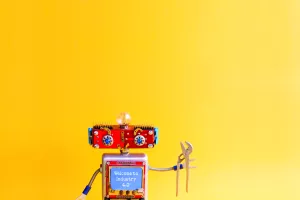 Welcome to industry 4.0 concept. IT specialist steampunk machinery robot, smiley red head, blue monitor body, pliers. New economic future message on blue display. Yellow background copy space.