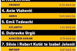 Ivan Čermak s Croduxovom grupacijom ima 6,2 milijarde kuna prihoda, a odmah do njega je Adris grupa (6,01 milijarda), koja doduše nije u većinskom vlasništvu Ante Vlahovića, ali je njegova riječ – dugo godina kao predsjednika Uprave, a sad kao predsjednika Nadzornog odbora – odlučujuća. Emil Tedeschi većinski je vlasnik Atlantic grupe (5,51 milijarda), a Dubravko Grgić stoji iza Koncerna Agram (4,76 milijardi).