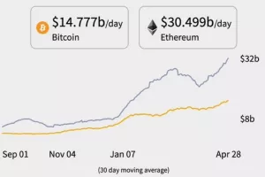 Broj jedinstvenih ethereum adresa nedavno se popeo preko 50 milijuna, ukupna vrijednost transakcija svakodnevno doseže nove razine, dok je prosječna vrijednost transakcija konzistentno više nego dvostruko veća od onih putem bitcoina. Iako nije direktna usporedba, Paypal koji vrijedi 300 milijardi podmiruje oko 2,5 milijardi dolara dnevno, dok ethereum koji vrijedi 430 milijardi podmiruje oko 30 milijardi dolara dnevno.