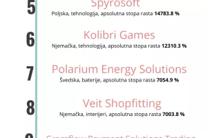 Na drugom mjestu našao se latvijski fintech Sun Finance koji je u periodu od 2016. do 2019. ostvario rast od čak 61837,8 posto. Zanimljivo, svih top deset tvrtki među kojima su i poljska softverska firma Spyrosoft, njemački Kolibri Games, švedski Polarium Energy Solutions nove su na listi. Tko je još u samom vrhu pogledajte u infografici.
