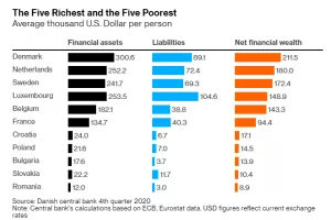 Prema podacima danske središnje banke za četvrto tromjesečje 2020., Danci imaju 208 tisuća dolara financijske imovine po glavi stanovnika, što je više nego dvostruko iznad prosjeka Europske unije. To je iznos koji se dobije nakon oduzimanja dugova. Valja napomenuti i da je Danska rekorderka po negativnim kamatama za štediše koje je uvela još 2012. godine.