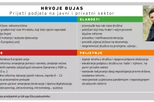 Izdvojili bismo dvije podjele koje je zorno detektirao. Među prijetnje je uvrstio 'eskaliranje podjela u društvu na 'naše' i 'njihove', na javni i privatni sektor'. 'Naše' i 'njihove' možemo protumačiti kao podjelu na tvrtke koje dobivaju poslove od središnje i lokalne države, koje su politički bliske vlasti, spremne uskočiti s legalnom donacijom za stranku i nelegalnom 'pinkom' za dužnosnike, i sve ostale, koji nisu u tom krugu.