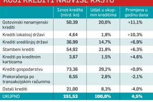 Zaista, nije se dogodilo ništa spektakularno. Gotovinski krediti nastavili su prošle godine rasti uobičajenim tempom od 11,1 posto i s novih pet milijardi kuna premašili su 40 posto udjela u ukupnim kreditima kućanstava. Premda nešto sporije, na valu subvencioniranih kredita stambeni krediti narasli su 6,3 posto i čine 44 posto svih kredita kućanstava. Razvoj utemeljen na kreditima potvrđuje se i u podacima o državnim jedinicama. Lokalna država bilježi rast kredita od čak 10,3 posto, a središnja također respektabilnih 6,9 posto i ima kreditna zaduženja osam puta veća od lokalaca. Jedan od uzroka tolikog rasta može biti domaći udjel u financiranju projekata iz fondova Europske unije. A moglo bi se očekivati da će država, županije, gradovi i općine imati još veće kreditne apetite od sljedeće godine, kad stupe na snagu nova pravila. Domaći novac u projektima EU sad mora sudjelovati s najmanje 15 posto vrijednosti investicije, a u sljedećem razdoblju taj će udjel biti podignut. Zasad se u Bruxellesu najozbiljnije pregovara o 25 posto domaćeg financiranja.