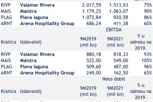 Za prvih devet mjeseci ove godine svi vodeći turistički hotelijeri zabilježili su snažan oporavak turističkog poslovanja u odnosu na isto razdoblje godinu ranije. Za razliku od prošle godine, kada su u većini svijeta bile na snazi mjere ograničenja kretanja s ciljem suzbijanja širenja zaraze, ove godine zahvaljujući postupnom ukidanju epidemioloških mjera i ponovnom otvaranjem ekonomije došlo je do oporavka putovanja i gotovo 55 postotnog rasta noćenja. Navedeno se preslikalo i na poslovanje domaćeg turističkog sektora. Vodeće turističke kompanije, poput Valamara, Maistre, Plave lagune i Arene udvostručili su prihode od prodaje. Oporavak prihoda bio je popraćen još snažnijim rastom operativnih pokazatelja poput EBITDA-e.