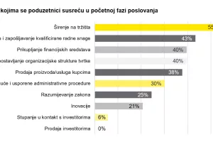 Na vrhu liste izazova s kojima se poduzetnici susreću u početnoj fazi poslovanja nalazi se izazov širenja na tržišta (55 posto), dok je na drugome mjestu izazov pronalaska i zapošljavanja kvalificirane radne snage, što je istaknulo njih 43 posto. Na trećem mjestu izazova nalazi se prikupljanje financijskih sredstava te uspostavljanje organizacijske strukture tvrtke. Zanimljivo je kako su otežavajuće i usporene administrativne procedure, koje nerijetko zadaju poduzetnicima glavobolje, tek na šestom mjestu liste izazova.