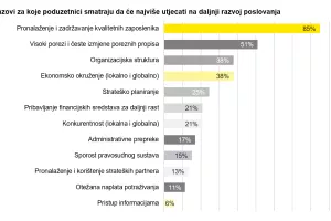 Uz brojne zanimljive informacije, istraživanje donosi pregled izazova za koje poduzetnici smatraju da će najviše utjecati na daljnji razvoj njihovih poslovanja. Pronalaženje i zadržavanje kvalitetnih zaposlenika percipirano je kao najveći izazov (85 posto), dok su na drugom mjestu visoki porezi i česte izmjene poreznih propisa (51 posto).