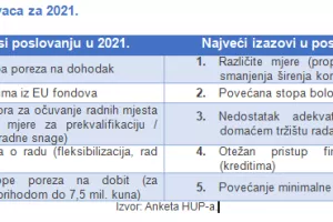 Najveći pozitivan doprinos poslovanju u 2021. trebao bi imati takozvani peti krug porezne reforme, prije svega smanjenje poreznih stopa u sustavu oporezivanja dohotka. Kao najveće moguće probleme u poslovanju u 2021. godini poslodavci vide različite restriktivne mjere (propise) koji se donose s ciljem smanjenja širenja koronavirusa.