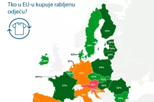 33 posto Hrvata navodi da kupuje rabljenu odjeću umjesto nove (devet postotnih bodova ispod prosjeka EU-a). Žene su tome sklonije nego muškarci (39 posto žena u odnosu na 26 posto muškaraca).40 posto hrvatskih građana razmišlja o klimatskim promjenama kad traži posao. Ta je brojka ponešto viša za ispitanike u dobi od 15 do 29 godina (43 posto).